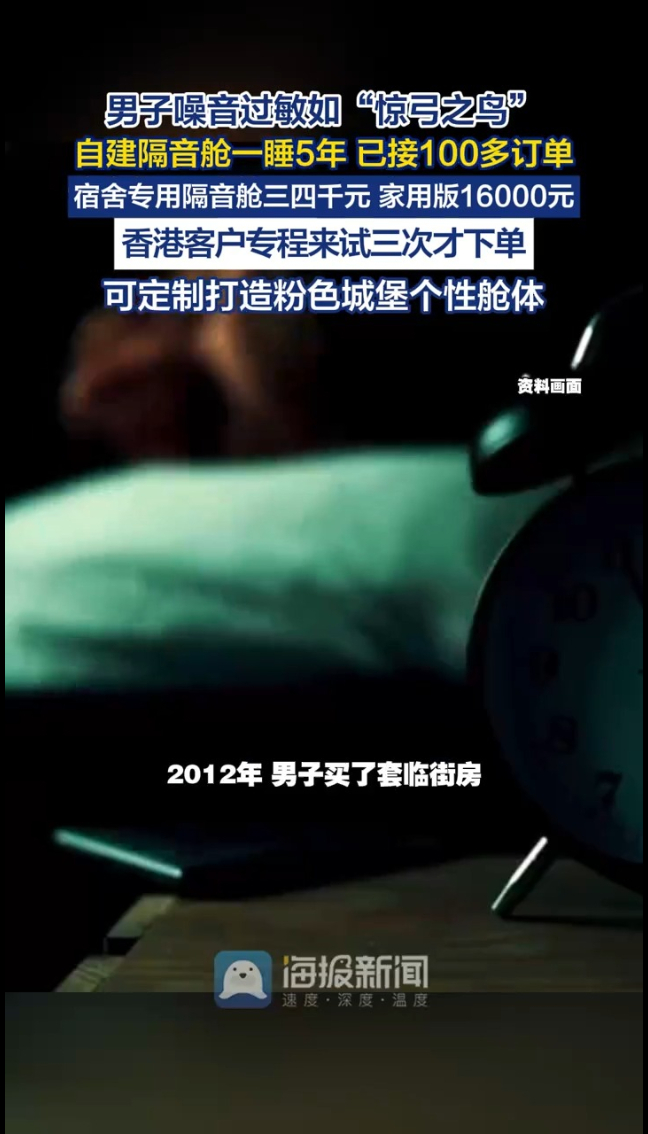 2012年,男子买了套临街房,从此被鸣笛、拖椅子、剁肉声折磨得像个“惊弓之鸟”。卖房、租房、住酒店全试过,都没用。从事建筑行业的他,偶然接触隔音工程,2020年自己研发出一款隔音舱。第一晚爱人陪他睡,后来他独自睡,一睡就是5年。他把经历发上网,两年多接了100多个订单!