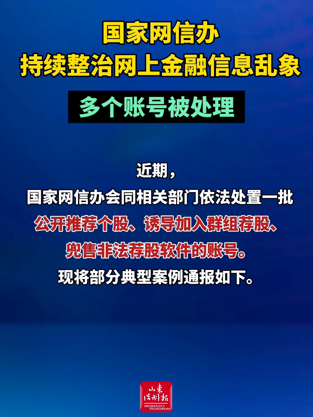 近期,国家网信办会同相关部门依法处置一批公开推荐个股、诱导加入群组荐股、兜售非法荐股软件的账号。现将部分典型案例通报如下。