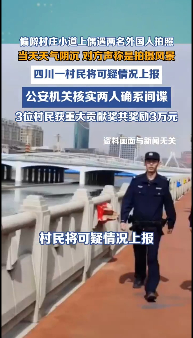 主播说丨偏僻小道上偶遇两名外国人拍照,市民将可疑情况上报!雅安3人举报间谍获奖3万元海报新闻 | 04-16 原创大众新闻·海报新闻 微信扫码扫码下载客户端(海报新闻综合红星新闻 编辑 刘泽 潘雯 张光)