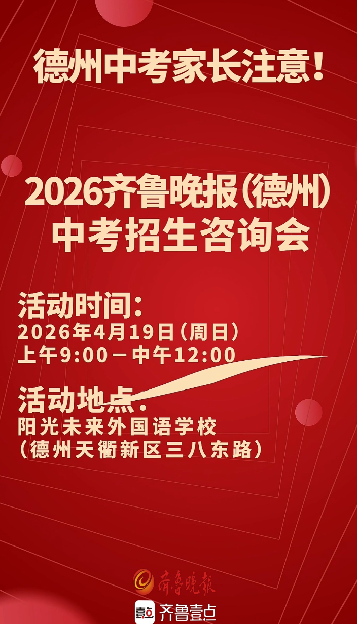 果然视频丨2026齐鲁晚报(德州)中考招生咨询会来啦齐鲁晚报·齐鲁壹点客户端 19:28原创为更好地服务中考学生和家长,齐鲁晚报·齐鲁壹点德州融媒中心将于4月19日(周日)上午9:00-中午12:00,在德州天衢新区三八东路阳光未来外国语学校开展2026年德州中考招生咨询会活动,活动现场面对面咨询全市普通高中学校、职业类学校、技工类学校以及在德州有招生资格的外地职业类学校,一站式获取权威招生信息。(齐鲁晚报·齐鲁壹点 刘超)