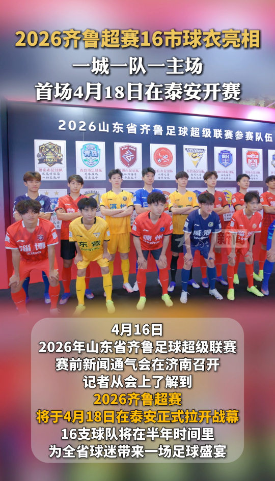 2026齐鲁超赛16市球衣亮相,首场4月18日在泰安开赛大众新闻客户端 20:45原创4月16日,2026年山东省齐鲁足球超级联赛赛前新闻通气会在济南召开。记者从会上了解到,2026齐鲁超赛将于4月18日在泰安正式拉开战幕。全省16市“一城一队一主场”,16支球队代表各市最高业余足球水平,将在半年时间里为全省球迷带来一场足球盛宴。(大众新闻记者 荆新年 宫小昀 王建)
