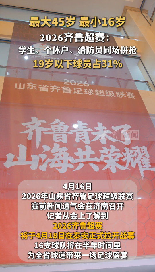 最大45岁,最小16岁!2026齐鲁超赛19岁以下球员占31%大众新闻客户端 20:45原创4月16日,2026年山东省齐鲁足球超级联赛赛前新闻通气会在济南召开。记者从会上了解到,赛事共报名运动员628人,最大45岁、最小16岁,平均年龄23.7岁,比去年大幅下降,其中19岁(含)以下194人,占比约31%,涵盖学生、教师教练、企事业职工、个体户、消防员、司机、销售员等群体,体现了广泛的足球群众基础。(大众新闻记者 荆新年 宫小昀 王建)