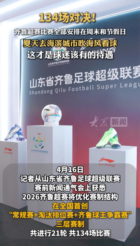 134场对决!齐鲁超赛比赛全部安排在周末和节假日大众新闻客户端 昨天22:06原创4月16日,记者从山东省齐鲁足球超级联赛赛前新闻通气会上获悉,2026齐鲁超赛将优化赛制结构,在全国首创“常规赛+淘汰排位赛+齐鲁球王争霸赛”三层赛制,共进行21轮共134场比赛,赛事均安排在周末及法定节假日举行,避开中高考、省运会开闭幕式及中超联赛山东球队主场日。夏季部分赛事安排在青岛、烟台、日照等海滨城市,兼顾比赛质量与观赛体验,真正方便市民、方便球迷。(大众新闻记者 荆新年 宫小昀 王建)