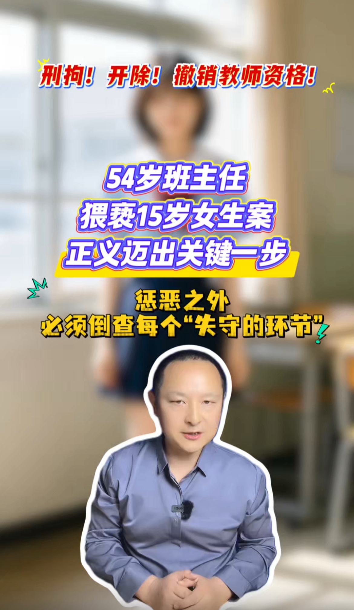 半岛时评|刑拘+开除+撤销教师资格,54岁班主任猥亵15岁女生案,正义迈出关键一步,惩恶之外,必须倒查每个“失守的环节”半岛都市报·半岛新闻客户端 19:12原创半岛时评|刑拘+开除+撤销教师资格,54岁班主任猥亵15岁女生案,正义迈出关键一步,惩恶之外,必须倒查每个“失守的环节”(半岛全媒体记者 姜瑞胜 宋总业)