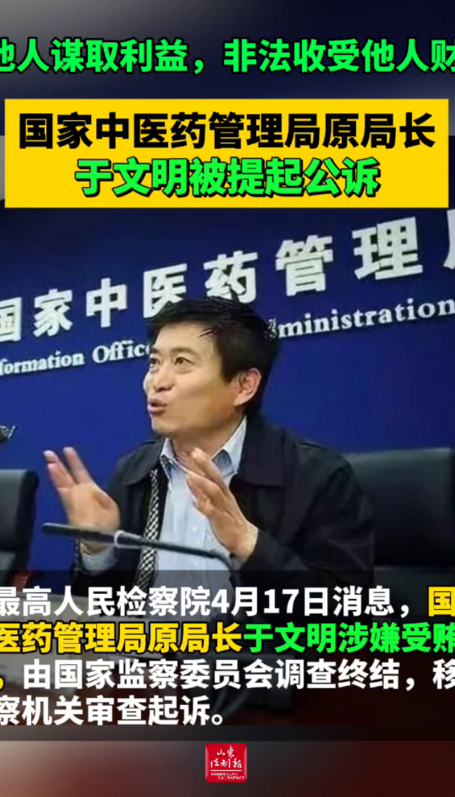 据最高人民检察院4月17日消息,国家中医药管理局原局长于文明涉嫌受贿一案,由国家监察委员会调查终结,移送检察机关审查起诉。最高人民检察院依法以涉嫌受贿罪对于文明作出逮捕决定,并指定由天津市人民检察院第一分院审查起诉。近日,天津市人民检察院第一分院已向天津市第一中级人民法院提起公诉。