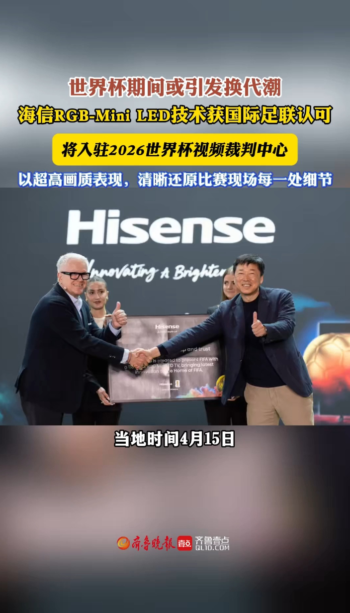 海信RGB-Mini LED将入驻世界杯视频裁判中心齐鲁晚报·齐鲁壹点客户端 11:10原创全球顶级体育赛事始终是显示技术的“进化窗口”。当地时间4月15日,国际足联与2026世界杯全球官方赞助商海信在瑞士苏黎世总部共同宣布,海信正式成为2026世界杯VAR(视频助理裁判)显示技术官方合作伙伴。海信RGB-Mini LED电视将入驻2026世界杯视频裁判中心,以超高色域与超高色准的画质表现,清晰还原比赛现场每一处细节,助力视频助理裁判精准判罚。 (齐鲁晚报·齐鲁壹点 台雪超)