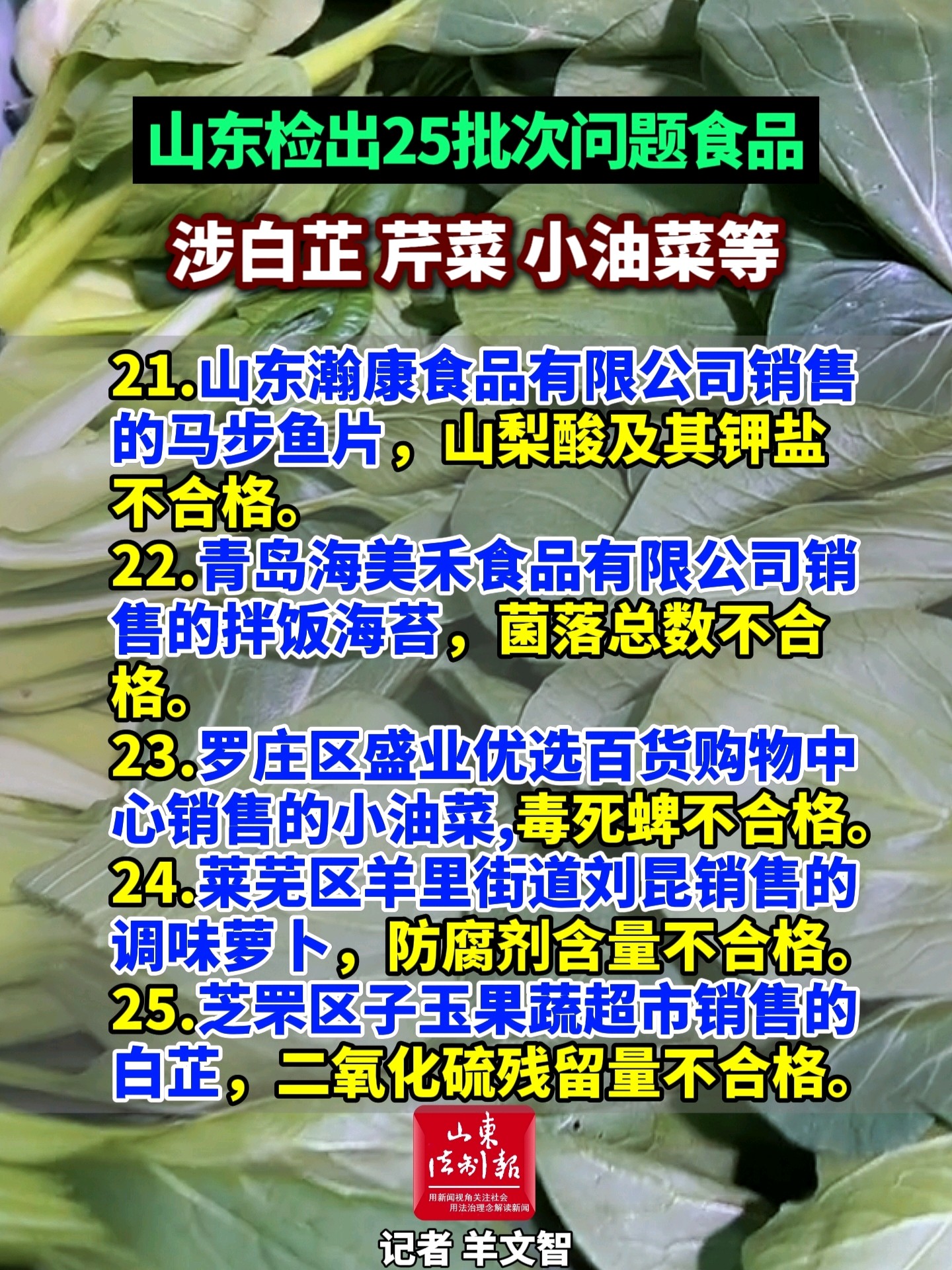 山东检出25批次问题食品,涉白芷、芹菜、小油菜等