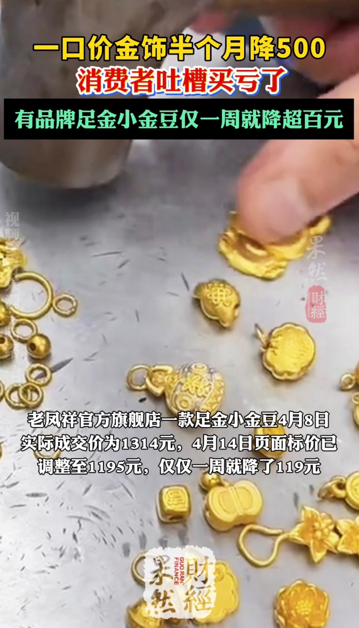 果然财经|一口价金饰半个月降500,消费者吐槽买亏了 13:50 原创齐鲁晚报·齐鲁壹点客户端 微信扫码扫码下载客户端近日,多个知名黄金品牌旗下的“一口价”黄金纷纷出现不同幅度降价。据21财经客户端,不少已经入手的消费者纷纷吐槽自己“买亏了”。