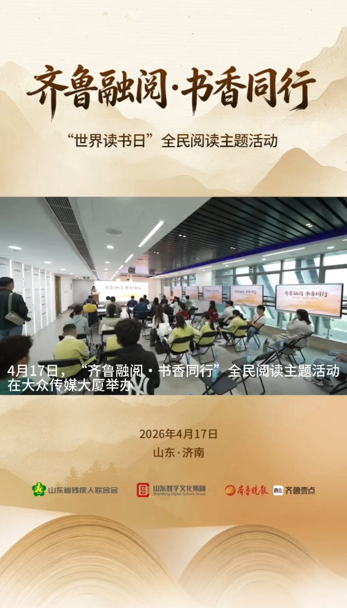 壹视频|齐鲁融阅,书香同行,共赴全民阅读暖心之约大众报业·齐鲁壹点 15:15阅读点亮梦想,书香浸润心灵。4月17日,在第31个“世界读书日”来临之际,由山东省残疾人联合会、山东数字文化集团、齐鲁晚报·齐鲁壹点、山东大学主办,济南特殊教育中心、济南市阅读协会、约读书房协办的“齐鲁融阅·书香同行”全民阅读主题活动在大众传媒大厦成功举办。