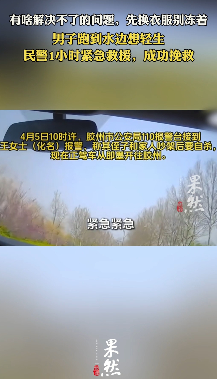 果然视频|男子跑到水边想轻生,民警1小时紧急救援,成功挽救齐鲁晚报·齐鲁壹点客户端 15:53原创“有啥解决不了的问题,先换衣服别冻着!”4月5日,在山东青岛,一男子跑到水边想轻生,民警1小时紧急救援,成功挽救 。