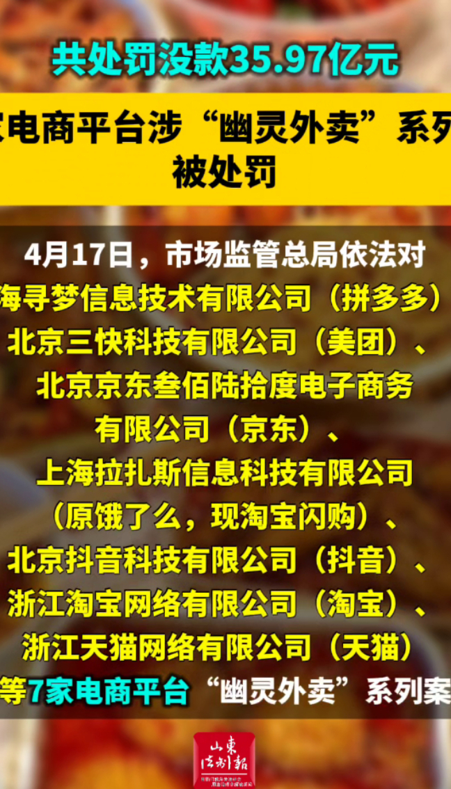 4月17日,市场监管总局依法对上海寻梦信息技术有限公司(拼多多)、北京三快科技有限公司(美团)、北京京东叁佰陆拾度电子商务有限公司(京东)、上海拉扎斯信息科技有限公司(原饿了么,现淘宝闪购)、北京抖音科技有限公司(抖音)、浙江淘宝网络有限公司(淘宝)、浙江天猫网络有限公司(天猫)等7家电商平台“幽灵外卖”系列案,依据《中华人民共和国食品安全法》第一百三十一条、《中华人民共和国电子商务法》第八十三条的规定作出行政处罚决定,责令7家电商平台改正违法行为,暂停新增蛋糕店铺3至9个月不等,并处以罚没款共计35.97亿元。同时,依据《中华人民共和国食品安全法实施条例》第七十五条的规定,对7家平台企业法定代表人和食品安全总监合计处以罚款1968.74万元。(来源 央视新闻)