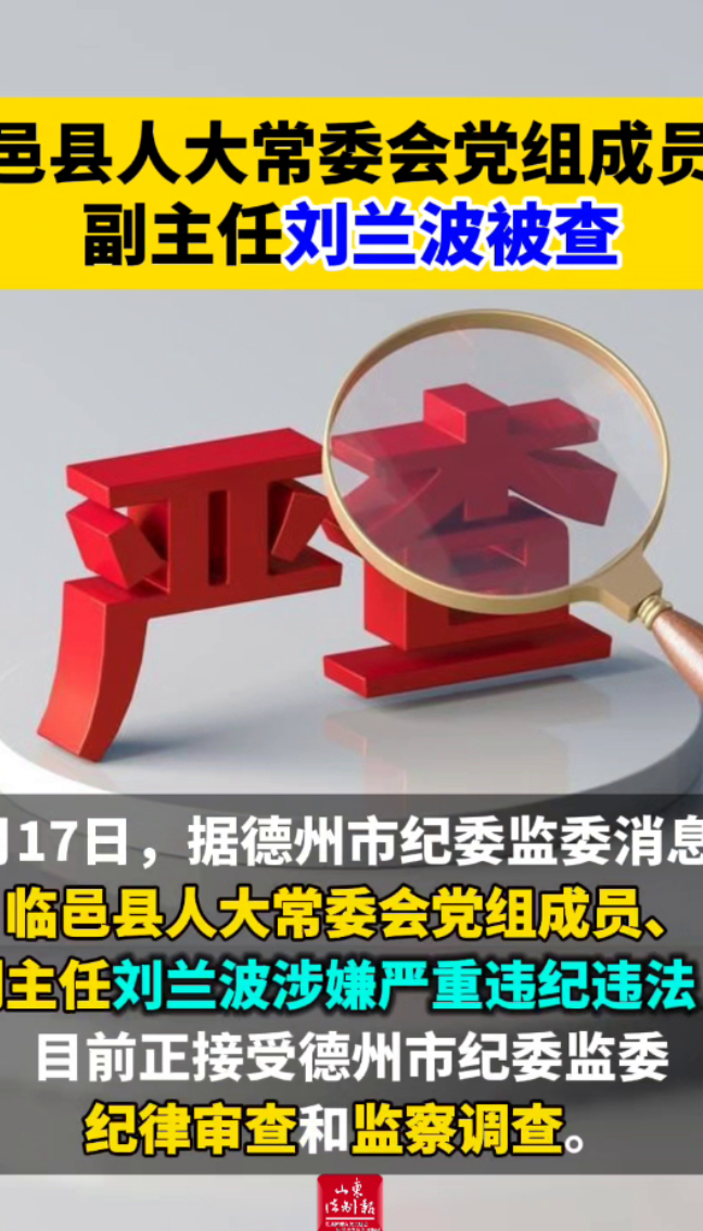 临邑县人大常委会党组成员、副主任刘兰波被查 18:40 大众新闻·山东法制报 微信扫码扫码下载客户端4月17日,据德州市纪委监委消息:临邑县人大常委会党组成员、副主任刘兰波涉嫌严重违纪违法,目前正接受德州市纪委监委纪律审查和监察调查。