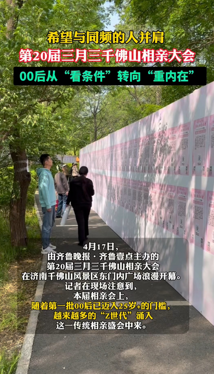 相亲会·观察|清醒不将就!Z世代的爱情观不谈捆绑只谈“同频”大众报业·齐鲁壹点 16:424月17日,由山东数字文化集团指导,齐鲁晚报·齐鲁壹点主办的第20届壹点动心·三月三千佛山相亲大会在济南千佛山风景区东门内广场火热进行中,吸引无数单身男女来到相亲会现场,找寻自己的有缘人。在这届相亲会报名的00后嘉宾中,不少人都提到“同频”一词,希望能找一个有共同话题、共同爱好的“同频共振”之人。对于在信息爆炸时代成长起来的Z世代而言,“聊得来”是心动的开关,“同频”才是长久的密钥。