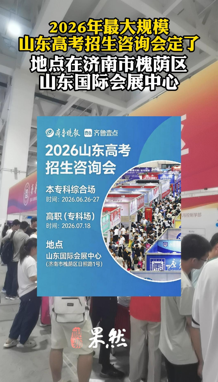 果然视频|2026山东规模最大高考招生咨询会时间地点确定齐鲁晚报·齐鲁壹点客户端 18:52原创2026年山东规模最大高考招生咨询会时间定了,地点为济南市槐荫区日照路1号山东国际会展中心,6月26日、27日举行本专科综合场,7月18日举行高职(专科)场,本届展会由齐鲁晚报·齐鲁壹点主办。 (齐鲁晚报·齐鲁壹点记者 尹明亮)