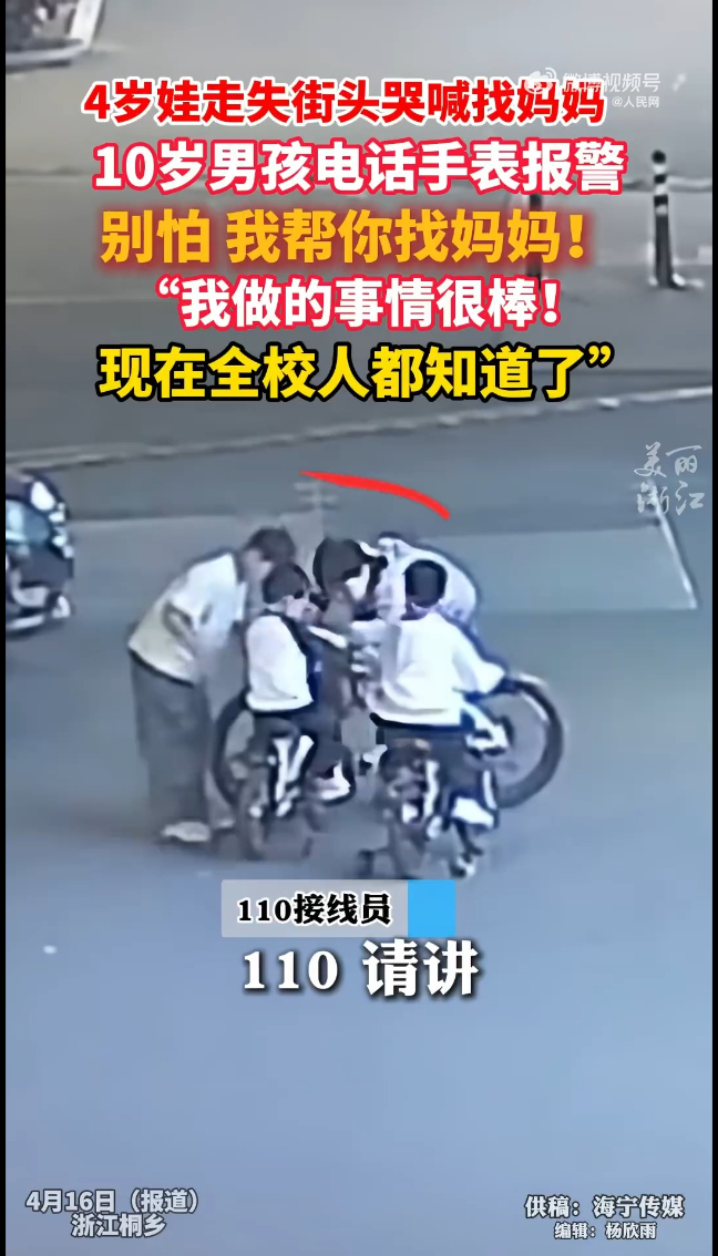 小学生路遇走失娃用电话手表报警人民网 17:49“我做的事很棒!现在全校人都知道了”......近日,浙江,4岁娃走失街头哭着找妈妈,10岁男孩见状上前安慰,并用电话手表报警。民警迅速赶到现场,帮孩子找到父母。民警到学校对报警男孩进行表彰#温暖中国#(美丽浙江)