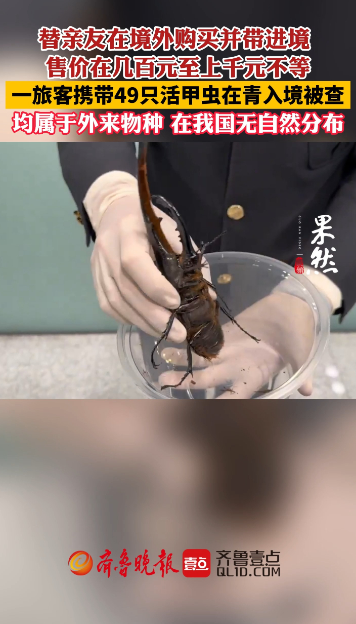 果然视频丨携带49只活体甲虫入境!一旅客在青被查齐鲁晚报·齐鲁壹点客户端 19:08原创日前,青岛胶东机场海关关员在对进境航班行李物品监管过程中,发现一名选择“无申报通道”进境旅客的托运行李图像异常。经开包检查共查获活体甲虫成虫47只,活体幼虫2只。旅客自述其亲友在境内经营“异宠”售卖生意,该批甲虫是替亲友在境外购买并携带进境,售价在几百元至上千元不等。目前,海关已对上述甲虫做检疫截留处置。 (齐鲁晚报·齐鲁壹点 李自强)