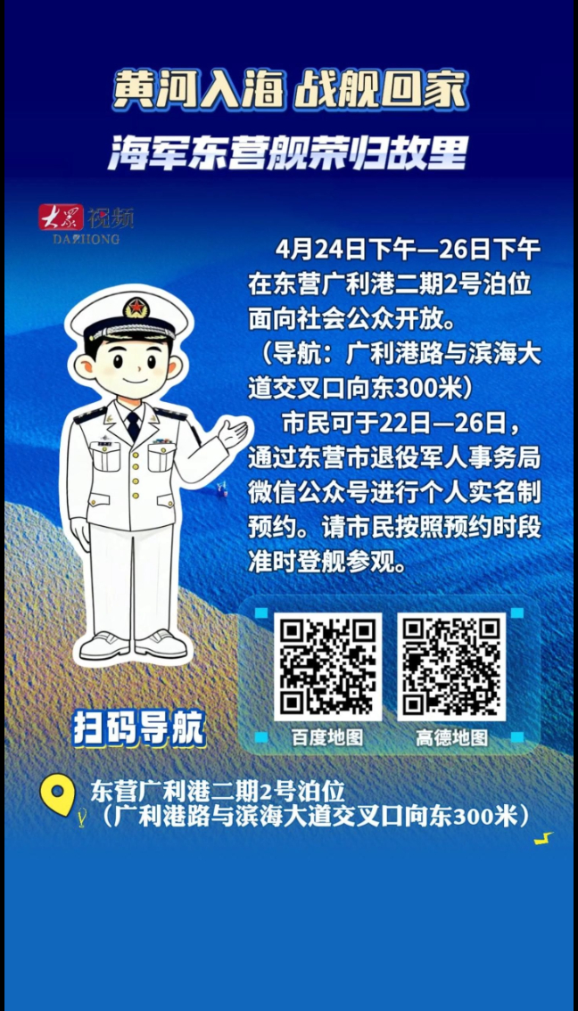 就在广利港!东营人的军舰来了,预约指南速看大众新闻 19:33原创4月21日至27日,海军东营舰将首次荣归故里,与东营市共同开展“战舰回家乡”活动。4月24日下午—26日下午在东营广利港二期2号泊位(导航:广利港路与滨海大道交叉口向东300米)面向社会公众开放。市民可于22日—26日,通过东营市退役军人事务局微信公众号进行个人实名制预约。请市民按照预约时段准时登舰参观。(大众新闻记者 刘海文 孙乐佳)