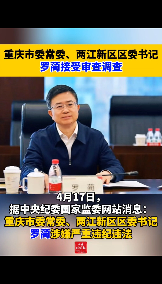 重庆市委常委、两江新区区委书记罗蔺接受审查调查山东法制报 | 昨天23:20 现场中央纪委国家监委网站 微信扫码扫码下载客户端4月17日,据中央纪委国家监委网站消息:重庆市委常委、两江新区区委书记罗蔺涉嫌严重违纪违法,目前正接受中央纪委国家监委纪律审查和监察调查。