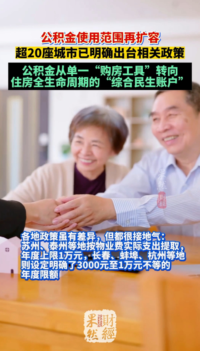 果然财经|公积金使用范围再扩容,盘活全国超10万亿沉淀资金齐鲁壹点 | 14:41 原创齐鲁晚报·齐鲁壹点客户端 微信扫码扫码下载客户端据央视新闻,截至目前,江苏、河北、辽宁、安徽、江西等多个省份的超20座城市,已明确出台相关政策,打破了公积金“只能买房还贷”的旧限制。具体来看,各地政策虽有差异,但都很接地气:苏州、泰州等地按物业费实际支出提取,年度上限1万元,长春、蚌埠、杭州等地则设定明确了3000元至1万元不等的年度限额。这波政策利好,实打实惠及每一个有住房需求的人。