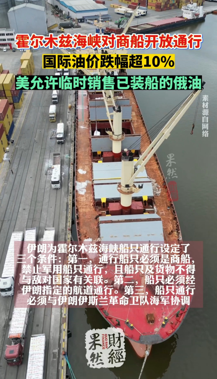 果然财经|霍尔木兹海峡开放,油价跌超10%!美临时放行俄油齐鲁壹点 | 14:44 原创齐鲁晚报·齐鲁壹点客户端 微信扫码扫码下载客户端综合新华社、央视新闻,伊朗外长17日表示,霍尔木兹海峡在黎巴嫩与以色列停火期间对所有商船通行完全开放,国际原油期货价格受此消息影响快速走低,跌幅超10%。美国海军随后向航运界发布通告称,霍尔木兹海峡部分区域的水雷威胁状况尚未完全明确,建议船只考虑避开相关海域。