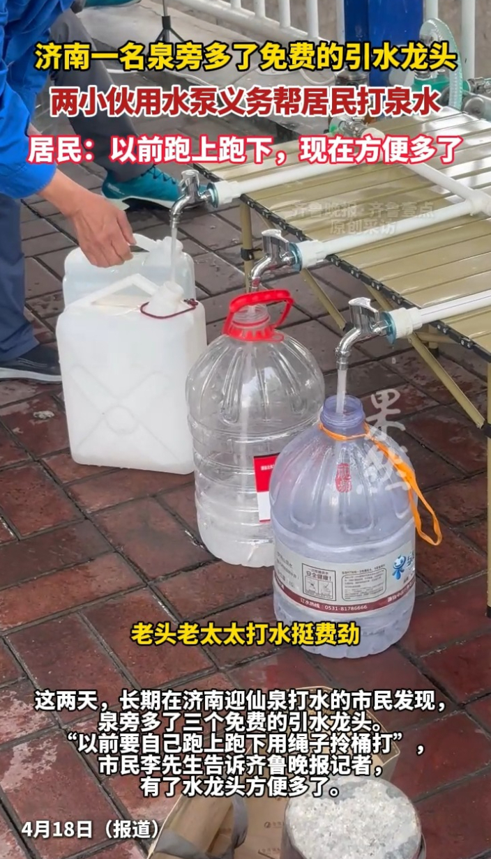 这两天,长期在济南迎仙泉打水的市民发现,泉旁多了三个免费的引水龙头。“以前自己跑上跑下用绳子拎桶打”,市民李先生告诉齐鲁晚报记者,有了水龙头方便多了。4月18日,用水泵帮大家打水的市民宋先生告诉记者,平时看到老人打水比较费劲,自己有抽水设备就经常来帮忙,以后会坚持帮大家。(齐鲁晚报·齐鲁壹点爆料电话:0531-85193656;邮箱:405617016@qq.com)