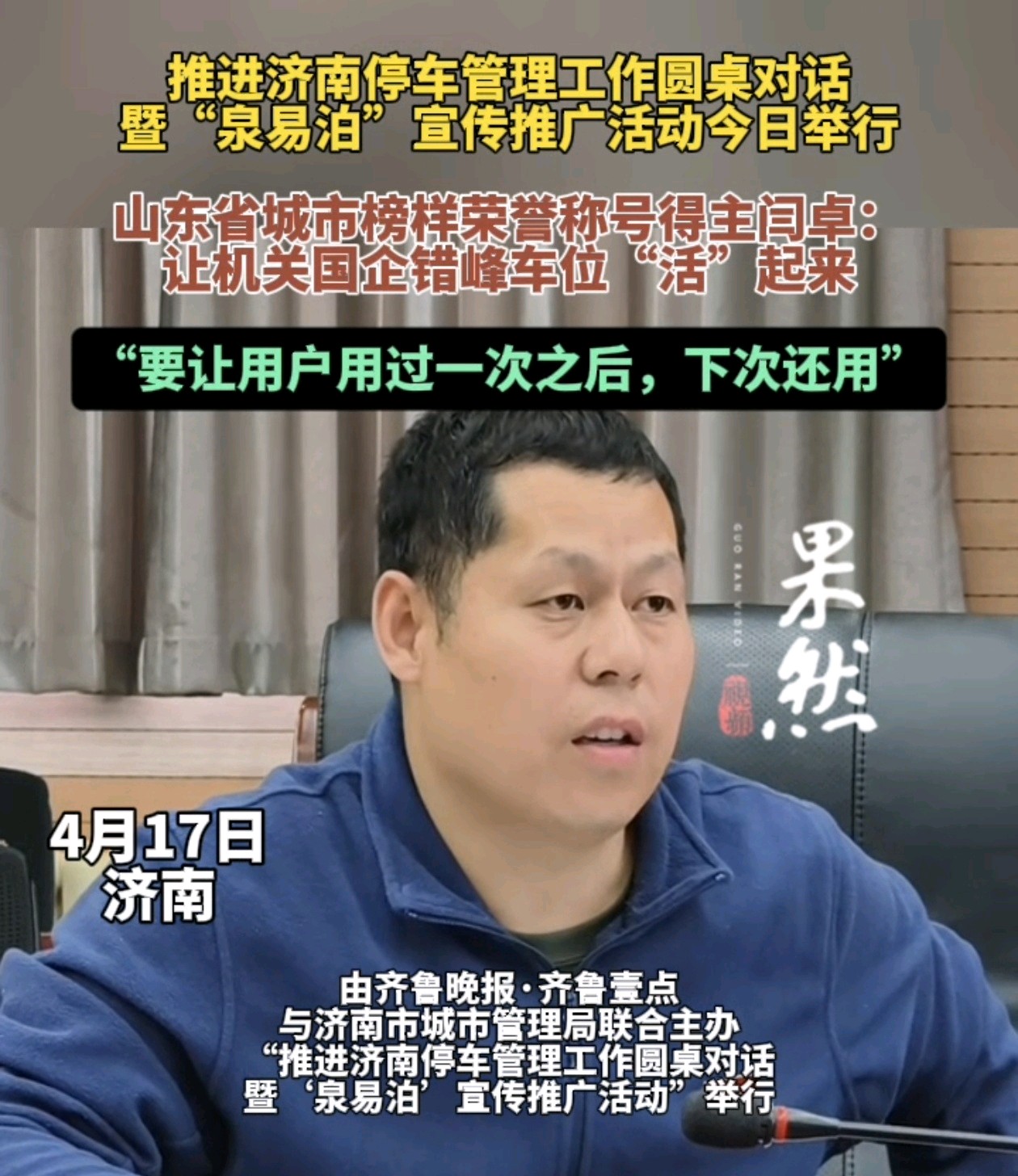 果然视频|推进济南停车管理工作圆桌对话举行,市民代表提建议齐鲁晚报·齐鲁壹点客户端 17:42原创4月17日,由济南市城管局、齐鲁晚报·齐鲁壹点联合主办的“共商推进济南停车管理工作”圆桌对话举办。山东省百姓学习之星、山东省宣讲达人闫卓结合自身经历,为“泉易泊”的推广和功能优化支招。(齐鲁晚报·齐鲁壹点 李梦瑶 史安琪 见习记者 冯子芯)