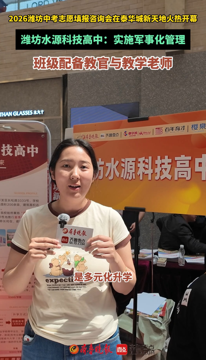 中招会|潍坊水源科技高中:实施军事化管理齐鲁晚报·齐鲁壹点客户端 昨天22:35原创4月18日,2026潍坊中考志愿填报咨询会在泰华城新天地火热开幕,公办高中、民办高中、综合高中、职业学校、技工学校的老师,现场面对面与家长沟通,为考生家长答疑解惑。潍坊水源科技高中:实施军事化管理,为每个班级配备一名教官和一名教学老师。 齐鲁晚报·齐鲁壹点 张晓慧 王钟玉