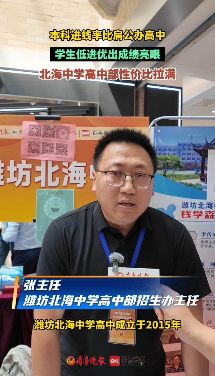 中招会|学生低进优出成绩亮眼,北海中学高中部性价比拉满齐鲁晚报·齐鲁壹点客户端 昨天22:38原创潍坊北海中学高中成立于2015年,本科进线率跟市区公办高中不相上下,前七年一直是稳居潍坊市区前三名。师资好、管理严、性价比比较高,学生低进优出。宿舍满额是8个人,宿舍里有空调,有独立的阳台,教室、宿舍、餐厅都有直饮水,都是免费的。 齐鲁晚报·齐鲁壹点 王钟玉 张晓慧