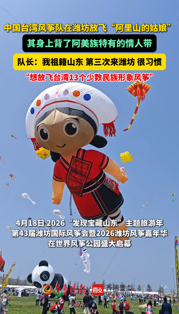 你好世界风筝都|中国台湾风筝队在潍坊放飞“阿里山的姑娘”齐鲁晚报·齐鲁壹点客户端 昨天22:39原创4月18日,2026“发现宝藏山东”主题旅游年、第43届潍坊国际风筝会暨2026潍坊风筝嘉年华在世界风筝公园盛大启幕。现场,来自中国台湾中庄风筝队的于科豪队长告诉齐鲁晚报·齐鲁壹点记者,自己的父亲是济南人,此次是他第三次来潍坊参加风筝节。其表示,中国台湾共有13个少数民族,此次只放了阿美族。 齐鲁晚报·齐鲁壹点 田思敏 马小杰