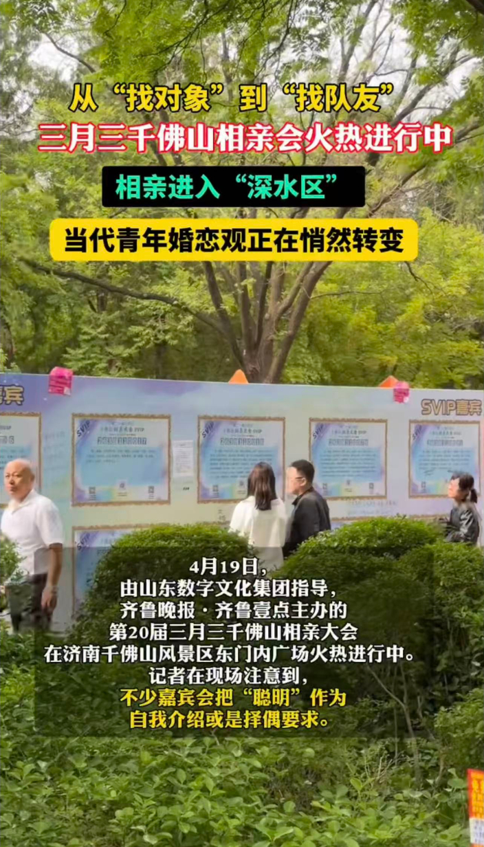果然视频|年轻人婚恋观悄然转变:从“找对象”到“找队友”!大众报业·齐鲁壹点 10:154月17日,由山东数字文化集团指导,齐鲁晚报·齐鲁壹点主办的第20届壹点动心·三月三千佛山相亲大会在济南千佛山风景区东门内广场火热进行中,吸引无数单身男女来到相亲会现场,找寻自己的有缘人。现场,记者发现不少嘉宾会把“聪明”“智商”“认知”等关键词,列入择偶清单。