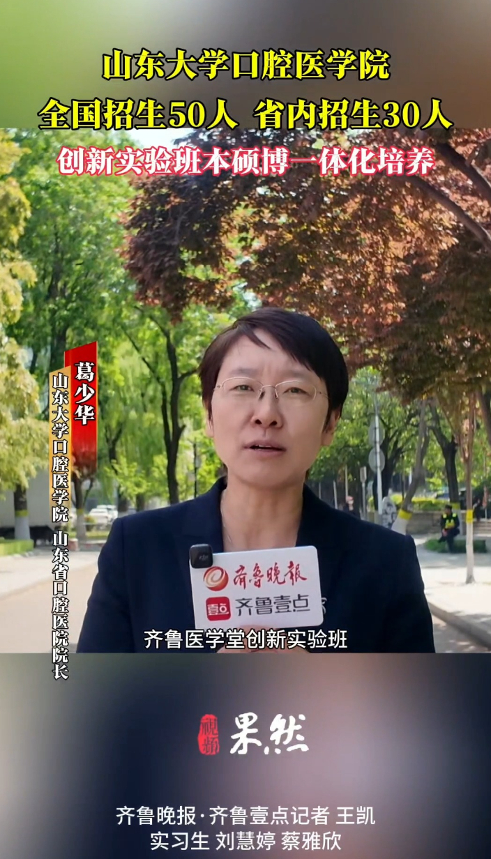 果然视频|山东大学口腔医学院:全国招生50人,省内计划30人 17:10 原创齐鲁晚报·齐鲁壹点客户端 微信扫码扫码下载客户端2026年4月18日,在山东大学第二届“大学节”暨强基/综招咨询会现场,山东省口腔医院院长葛少华接受记者采访时表示,今年计划全国招生50人,省内计划招生30人。今年的齐鲁医学堂创新实验班全国招生15人,含省内计划10人,采取本硕博一体化培养模式。(齐鲁晚报·齐鲁壹点记者 王凯 实习生 刘慧婷 蔡雅欣)