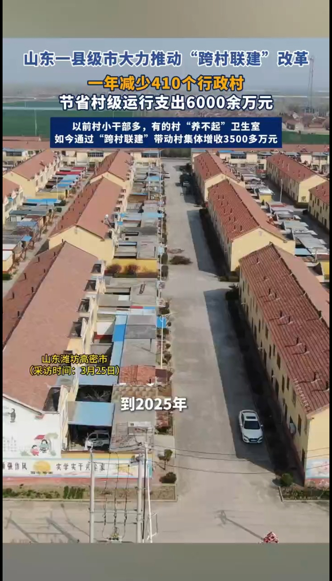 山东一县级市大力推动“跨村联建”改革,一年减少410个行政村,节省村级运行支出6000余万元