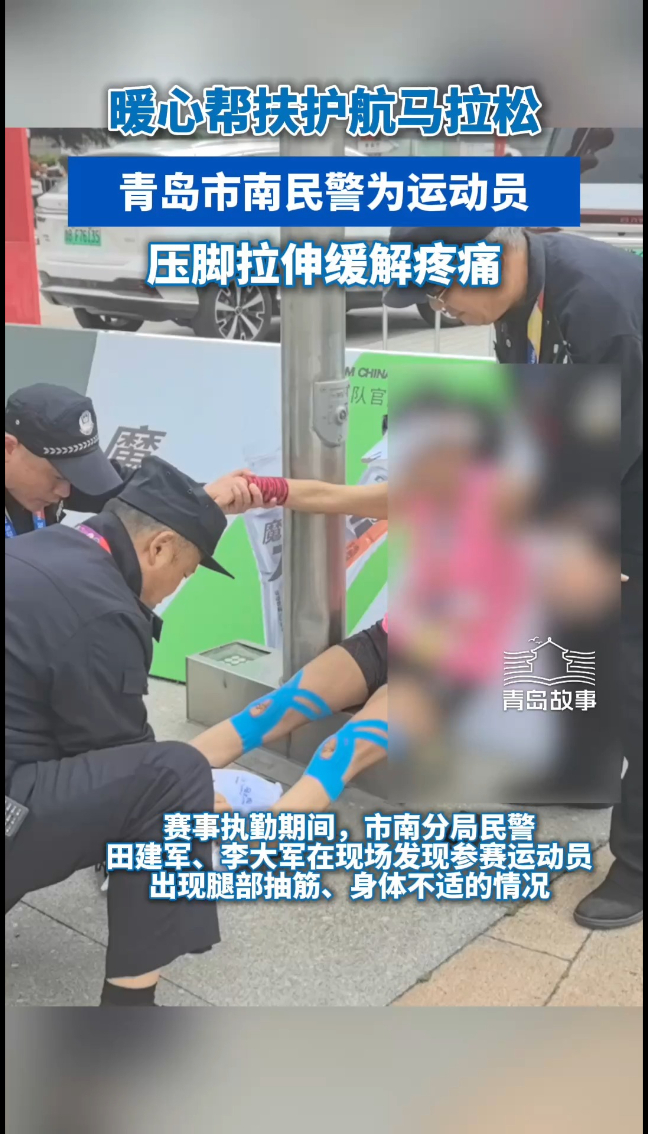 暖心帮扶护航马拉松,青岛市南民警为运动员压脚拉伸缓解疼痛