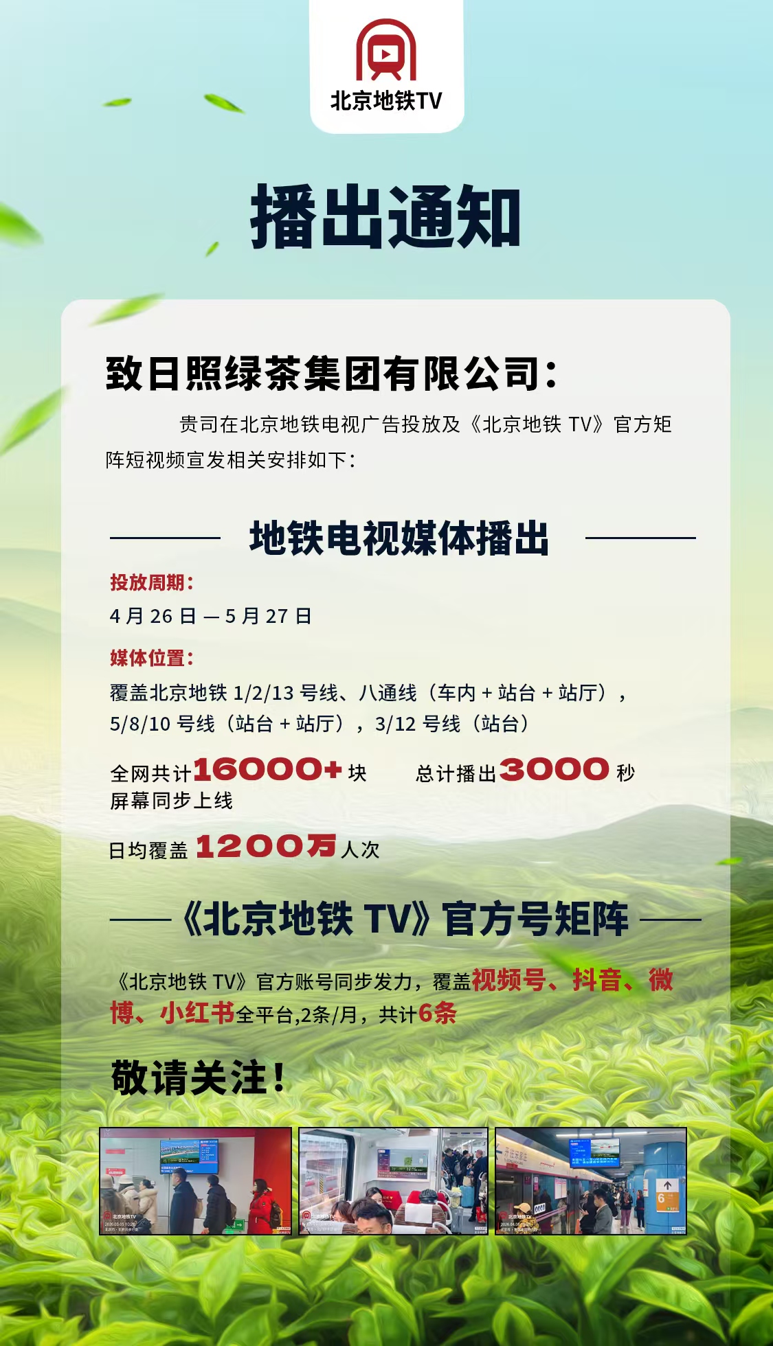 当春风吹暖黄海之滨,日照绿茶的“鲜爽时刻”正式开启!4月16日起,由日照绿茶集团制作投放的宣传短片正式登陆央视CCTV-1、13并机直播的《朝闻天下》栏目,每日早7时15分、8时15分黄金时段与全国观众见面,同时全面覆盖北京地铁9条线路的16000余块数字屏幕,以“国家级媒体+核心交通场景”的双轮传播矩阵,将北方春日茶礼的清香送至千家万户。