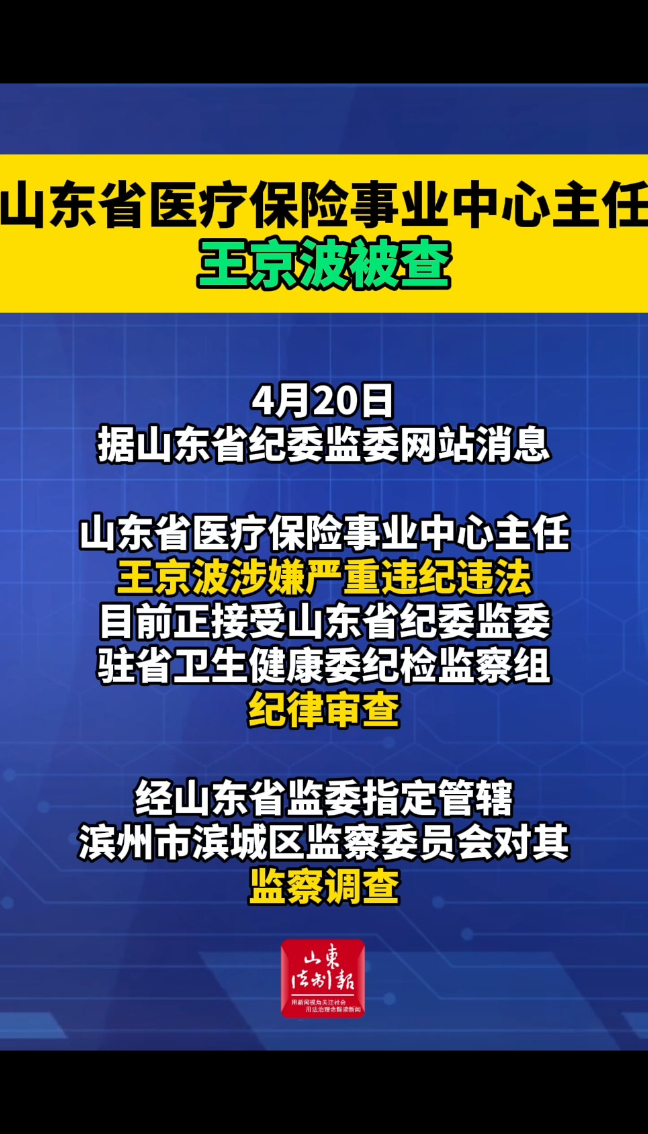 山东省医疗保险事业中心主任王京波被查 13:17 山东省纪委监委网站 微信扫码扫码下载客户端4月20日,据山东省纪委监委网站消息,山东省医疗保险事业中心主任王京波涉嫌严重违纪违法,目前正接受山东省纪委监委驻省卫生健康委纪检监察组纪律审查;经山东省监委指定管辖,滨州市滨城区监察委员会对其监察调查。