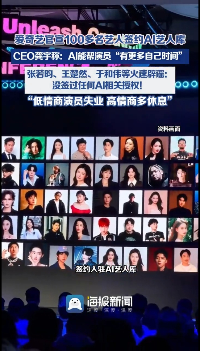 主播说丨爱奇艺官宣100多名艺人签约AI艺人库,CEO龚宇称:AI能帮演员“有更多自己时间”