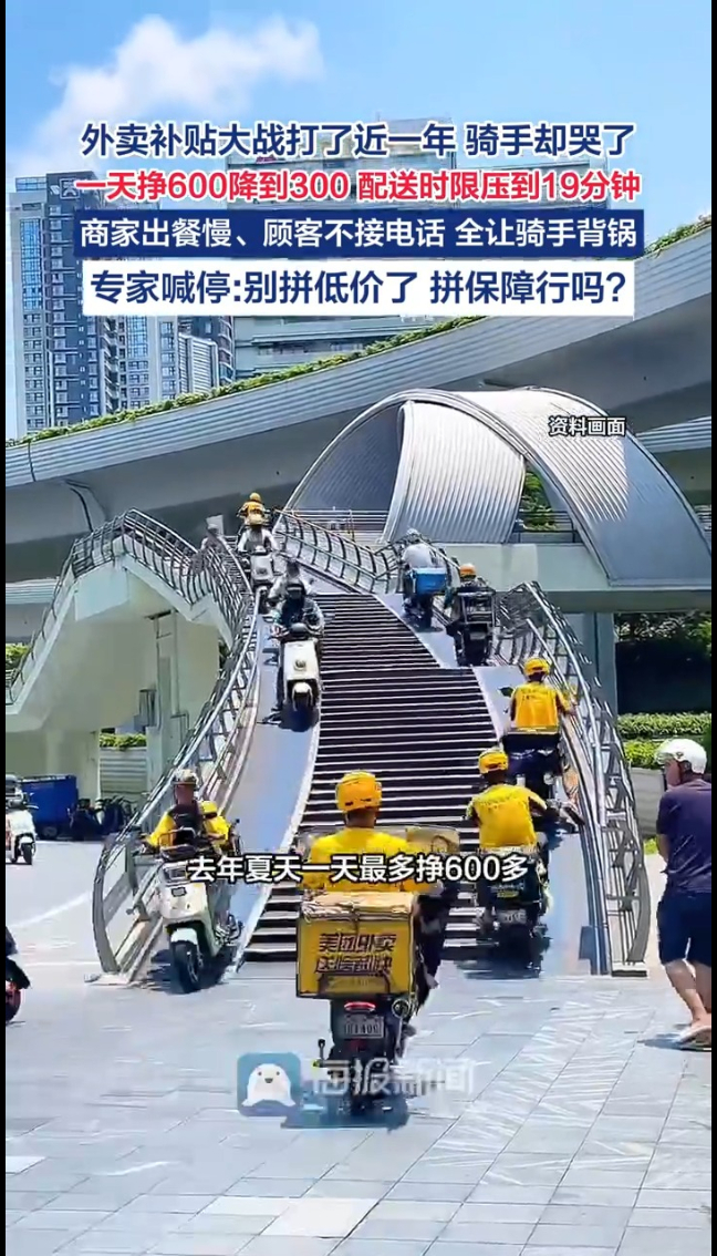外卖“补贴大战”看似惠民,实则内卷。有骑手坦言:去年夏天一天最多挣600多,现在只剩300左右。更惨的是,配送时限从30分钟一路压到19分钟,配送时限持续缩短,是所有受访骑手感受最明显的变化。而商家出餐慢、顾客不接电话,最后超时扣分的全是骑手。