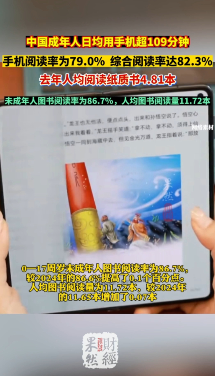 果然财经|我国成年人日均用手机超109分钟,手机阅读率近八成 昨天17:41 原创齐鲁晚报·齐鲁壹点客户端 微信扫码扫码下载客户端根央视新闻消息,数据显示2025年我国成年国民人均每天手机接触时长增至109.54分钟,手机阅读率也同步微增。2025年中国成年国民的手机阅读率为79.0%,较2024年的78.7%增长了0.3个百分点。越来越多的人选择通过听书和观看视频讲书的方式进行阅读,分别从2024年的38.5%和5.7%增长至2025年的 38.7%和6.3%。