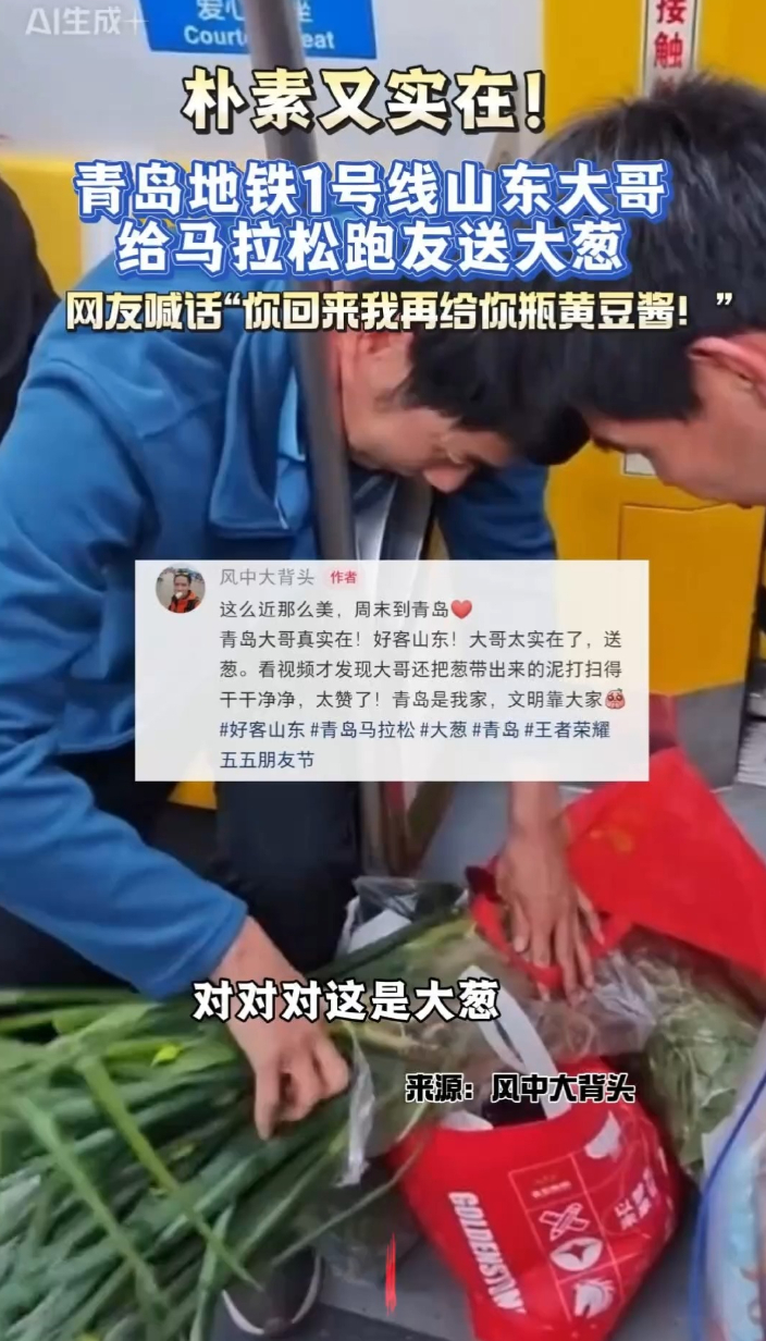 刚刚结束的海尔·2026青岛马拉松为万名跑者提供了一次齐聚山海的机会,也让更多人看到了青岛温暖美好的一面。网友“风中大背头”分享了在青岛地铁1号线上的经历——坐地铁偶遇热心大哥,分给了他一把山东大葱。热心大哥在分完大葱后,还细心地将抖落在地上的泥土清理干净。有网友留言道:“山东大汉的纯真厚道,青青小葱的清甜爽口,青岛地铁的包容度高——三者一脉,皆是齐鲁性情。”