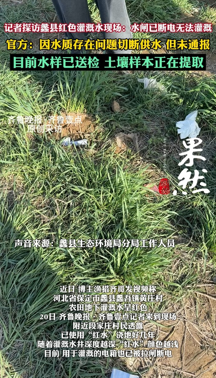 果然视频|官方回应蠡县红色灌溉水:已采样送检齐鲁晚报·齐鲁壹点客户端 19:20原创20日,齐鲁晚报·齐鲁壹点记者来到蠡县红色灌溉水现场,目前,用于灌溉的电箱已被拉闸断电。对此,蠡县生态环境局分局工作人员回复称,由生态环境局和镇党委研究之后,鉴于水质存在问题,担心老百姓继续使用,故切断了供水,但未发布停水通报。目前,相关部门已经连夜将水样送检,土壤样本正在提取。