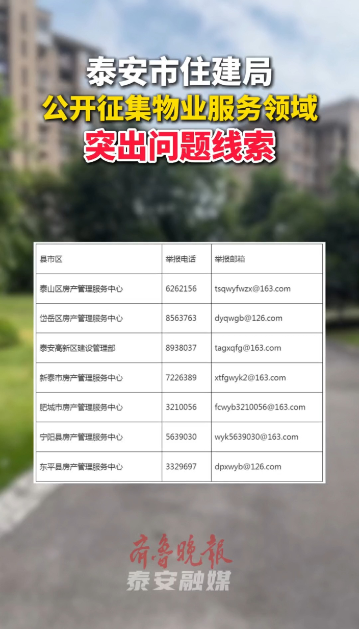 果然视频丨泰安公开征集物业服务领域突出问题线索,公布举报电话大众报业·齐鲁壹点 10:43齐鲁晚报·齐鲁壹点 近日,泰安市住房和城乡建设局网站,发布关于公开征集物业服务领域,突出问题线索的公告。 为深入贯彻落实上级关于整治群众身边不正之风和腐败问题的工作部署,进一步规范全市物业服务市场秩序,督促物业服务企业依法履约、诚信经营,切实解决住宅小区物业服务领域群众反映强烈的突出问题,维护广大业主合法权益,现面向社会公开征集全市范围内物业服务突出问题线索。