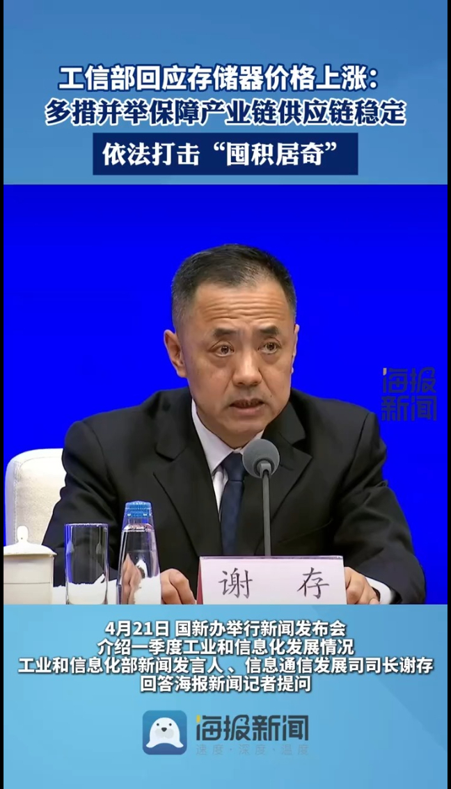 4月21日,工业和信息化部新闻发言人、信息通信发展司司长谢存在国新办发布会上回答海报新闻记者提问时回应了“存储器价格上涨,引发手机终端产品价格调整”这一情况。他表示,一方面,将增强供给能力、促进供需对接,鼓励内外资企业加大投资力度,提升产出能力。支持终端企业与存储器企业加强互动对接,拓宽多元化供应渠道。另一方面,通过多种手段维护市场秩序,引导存储器企业加强渠道管理,配合相关部门依法打击“囤积居奇”等扰乱市场行为。