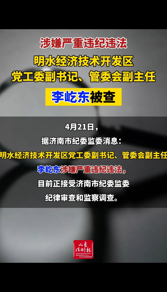 明水经济技术开发区党工委副书记、管委会副主任李屹东被查 16:07 现场山东省纪委监委网站 微信扫码扫码下载客户端4月21日,据济南市纪委监委消息:明水经济技术开发区党工委副书记、管委会副主任李屹东涉嫌严重违纪违法,目前正接受济南市纪委监委纪律审查和监察调查。