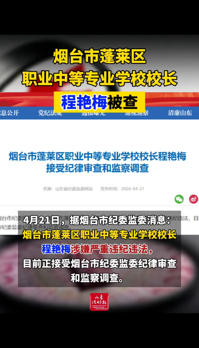 烟台市蓬莱区职业中等专业学校校长程艳梅被查 15:47 现场山东省纪委监委网站 微信扫码扫码下载客户端4月21日,据烟台市纪委监委消息:烟台市蓬莱区职业中等专业学校校长程艳梅涉嫌严重违纪违法,目前正接受烟台市纪委监委纪律审查和监察调查。