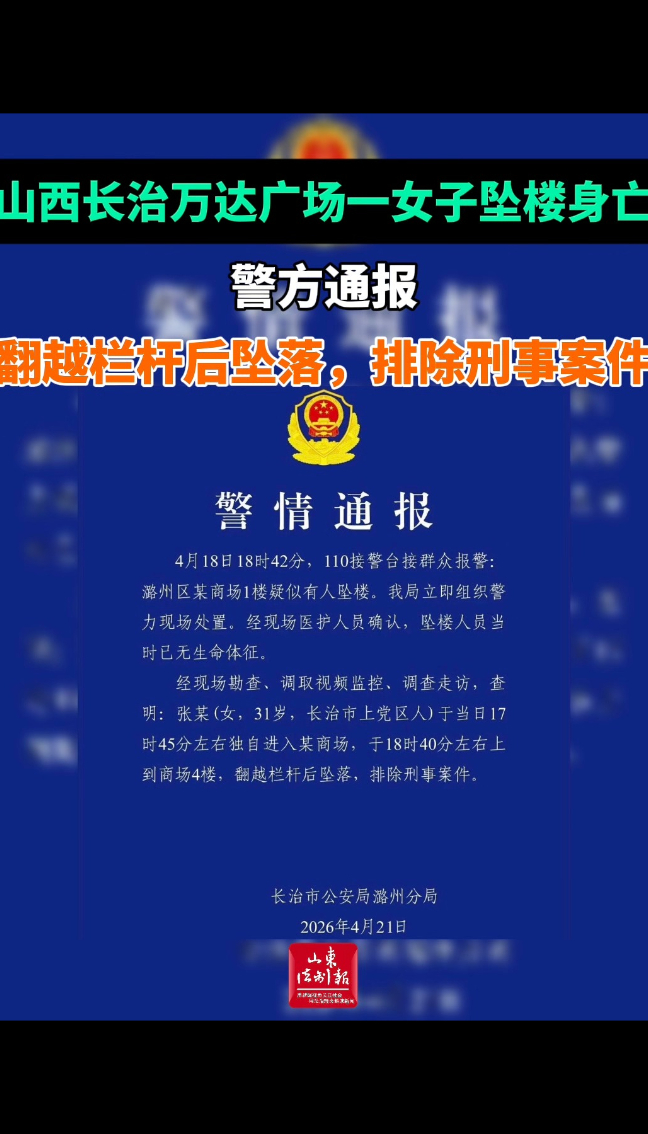 山西长治万达广场一女子坠楼身亡 警方通报:翻越栏杆后坠落,排除刑事案件