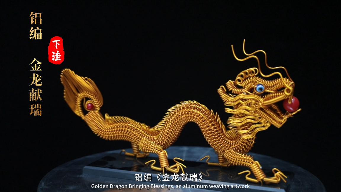 滨州沾化:铝编《金龙献瑞》 15:34 大众新闻·经济导报 微信扫码扫码下载客户端铝编《金龙献瑞》是滨州市沾化区传统铝编工艺的精品之作,以金色烤漆铝丝为原料,经手工缠编塑形而成,祥龙昂首衔珠,鳞爪分明,造型栩栩如生,尽显铝编工艺的精巧匠心与文化底蕴,更传递出“龙腾纳福、福运绵长”的美好祝愿。(王志浩)