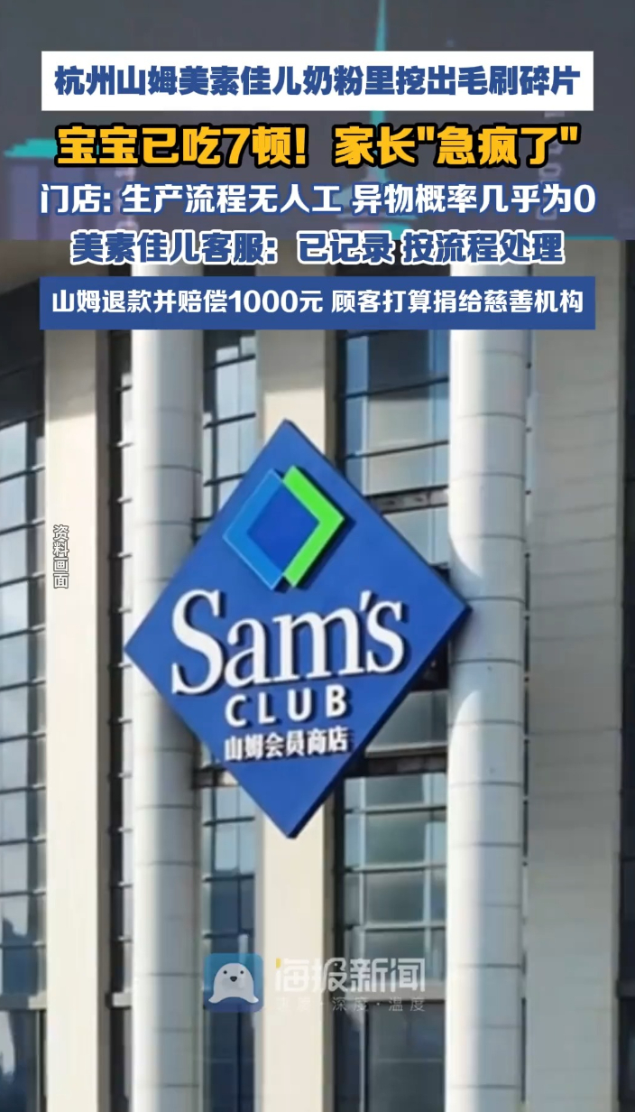 杭州山姆美素佳儿奶粉里挖出毛刷碎片!海报新闻 16:37杭州蒋先生在山姆买的美素佳儿婴儿奶粉里,挖出了毛刷碎片! 3月5日他在杭州江干山姆店,买了两罐800g的美素力源悦奶粉,花了近630元。4月10日双胞胎女儿出生回家开罐,到11日中午孩子已吃七顿。分装奶粉时发现罐里有毛刷碎片,急坏了一家人。山姆线上客服说过了售后时间不退不换,门店让他等了40分钟。17日门店回应,厂家流程没人工,有异物概率几乎为0,分装密封问题要等厂家反馈。