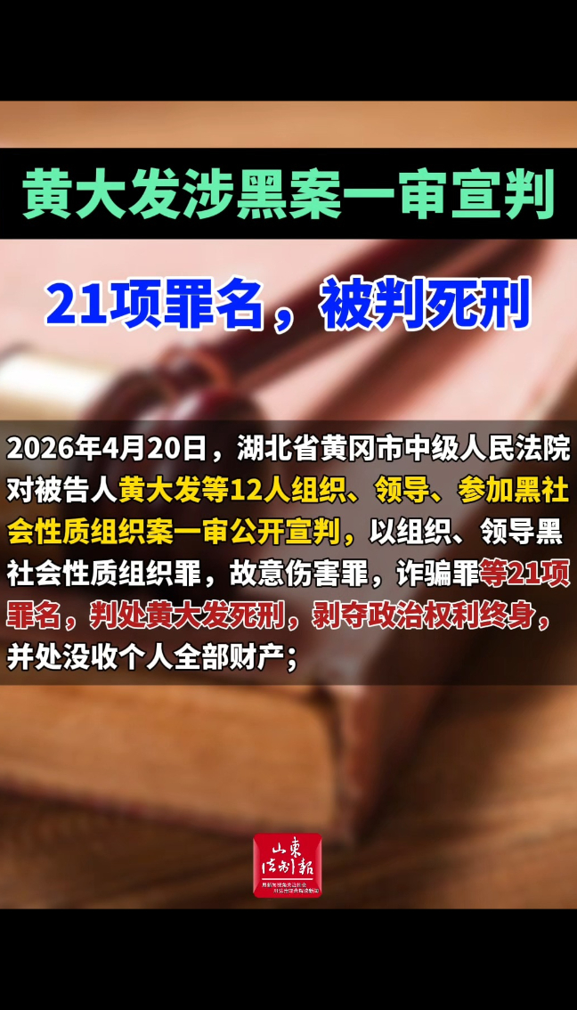 2026年4月20日,湖北省黄冈市中级人民法院对被告人黄大发等12人组织、领导、参加黑社会性质组织案一审公开宣判,以组织、领导黑社会性质组织罪,故意伤害罪,诈骗罪等21项罪名,判处黄大发死刑,剥夺政治权利终身,并处没收个人全部财产;对其他11名被告人分别判处有期徒刑十三年至二年二个月不等刑罚,并处罚金或没收个人全部财产。对该黑社会性质组织及涉案人员违法所得及其孳息、收益依法予以追缴,上缴国库。