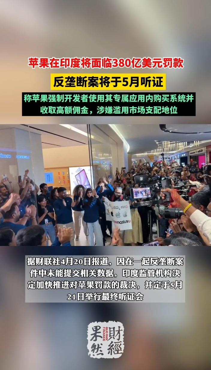 果然财经|苹果在印度将面临380亿美元罚款 16:47 原创齐鲁晚报·齐鲁壹点客户端 微信扫码扫码下载客户端据财联社4月20日报道,因在一起反垄断案件中未能提交相关数据,印度监管机构决定加快推进对苹果罚款的裁决,并定于5月21日举行最终听证会。