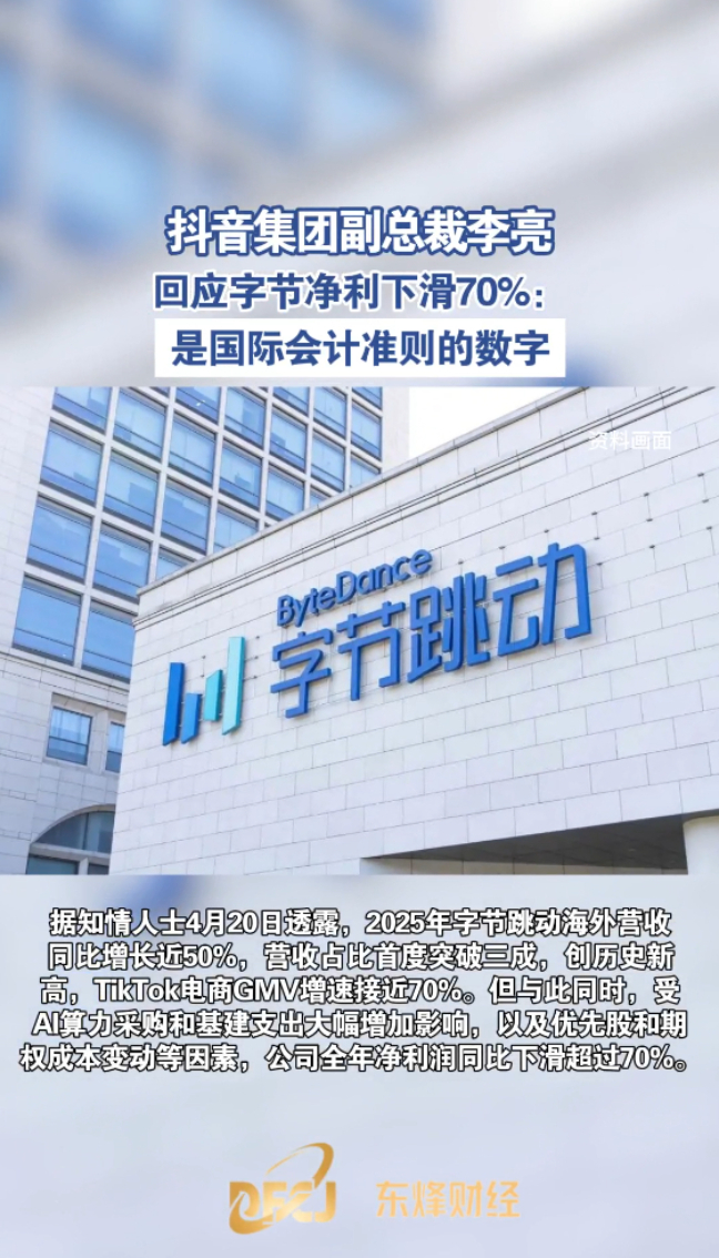 东烽财经丨抖音集团副总裁李亮回应字节净利下滑70%:是国际会计准则的数字 17:46 原创大众新闻·黄三角早报 微信扫码扫码下载客户端4月20日下午,李亮微博发文称:“相关报道中关于字节净利润下降70%,是国际会计准则的数字,这边除了新兴业务投资增大,还有优先股和期权成本变动因素(不反映运营实质)。实际因为抖音电商增速放缓和新兴业务相关投入增大,下半年经营利润率有小幅下滑,但远没有报道中这么大幅度。”(大众新闻记者 姚会英)